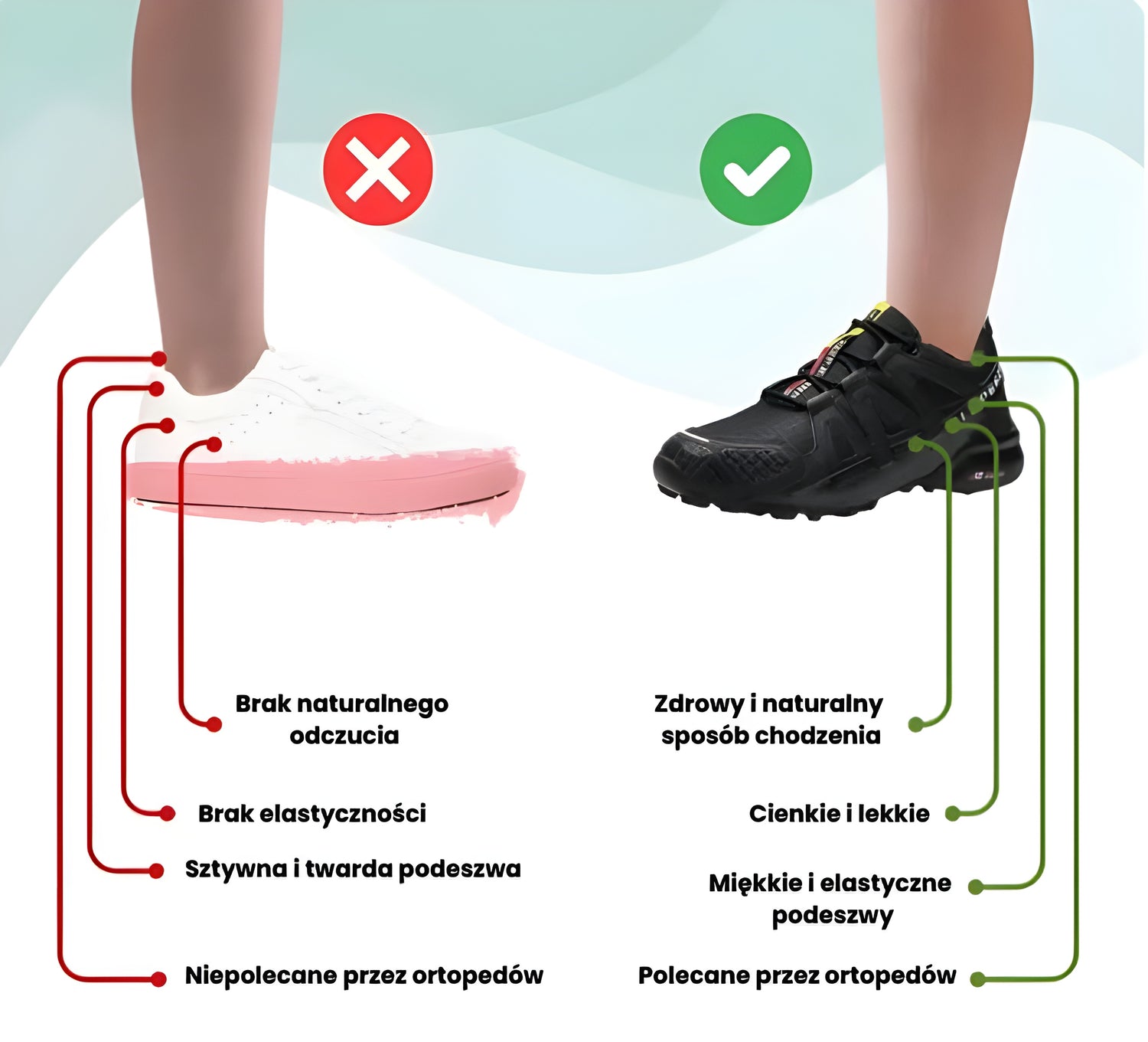 - Dla różnych bólów stóp, kolan i pleców – buty łagodzą dolegliwości takie jak: ból stóp, zapalenie rozcięgna podeszwowego, neuropatia, płaskostopie, ból pięty i haluksy – oferując ulgę, wsparcie, poprawę mobilności i zapobieganie nawrotom.